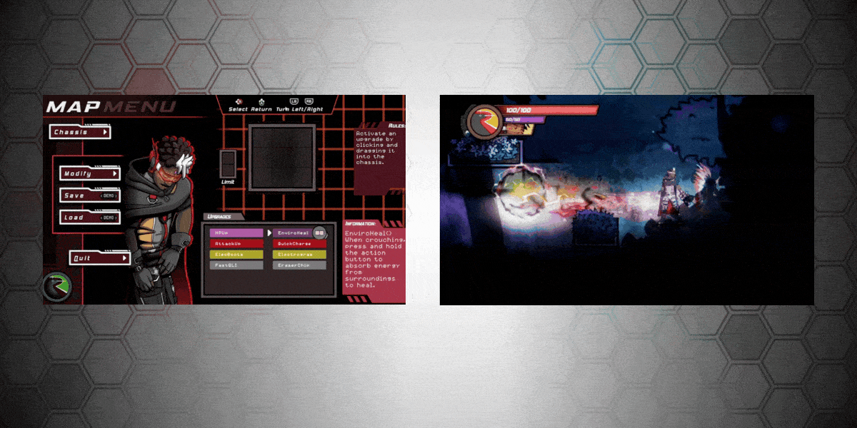 Find upgrades for your chassis throughout the world so that you can customize your abilities. Pick and choose which ones you want, and fuse similar upgrades together to create new moves or special traits!